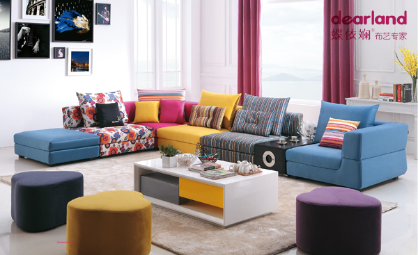 蝶依斓2014年家具展最新款布艺沙发在沙发的造型设计上,追求多变、个性化、层次感,采用圆润饱满、比例协调,弧形的线条与款式相结合,彰显青春、时尚气息,至善至美,用多色混搭风格演绎着青春的蓬勃与生机。