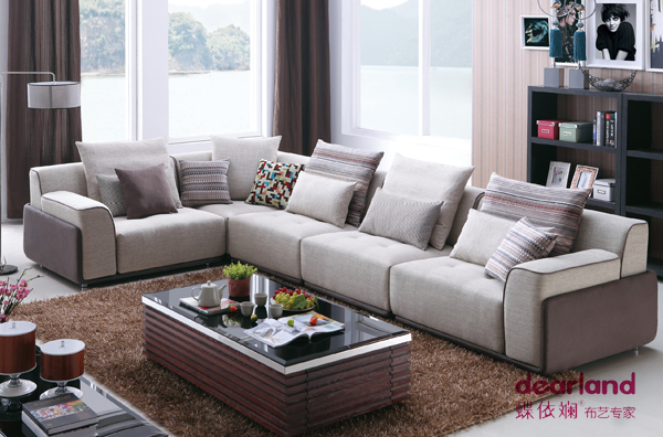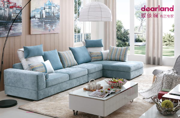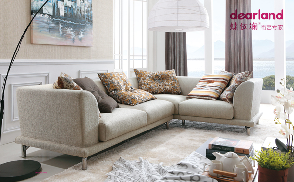 蝶依斓2014年家具展最新款布艺沙发在沙发的取材上,环保是蝶依斓二十年如一日所追求的永恒主题。如框架一般选用桉木框架,甚至是钢架材料,填充物多选用鹅绒和乳胶棉等纯天然材质,多种质感的面料混搭以满足众多消费者的需求。